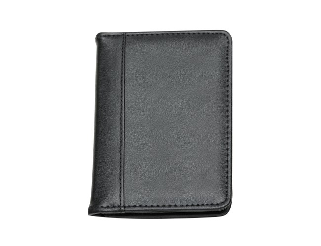 Bloco de anotações com calculadora solar plástica de 8 dígitos e suporte de nylon para caneta, acompanha mini caneta plástica com carga azul e acionamento por rotação.